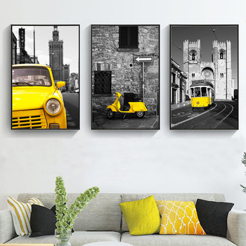 Póster de arte blanco y negro para coche, pintura al óleo sobre lienzo, carteles e impresiones, imagen artística de pared, vista de calle, coche amarillo, paisaje occidental